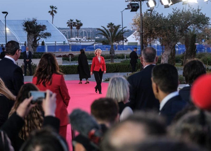 Under the beating Mediterranean sun on Thursday, Europe’s heads of state walked down a palm tree-lined red carpet, past very fancy yachts — and Cypriot military speedboats armed with machine guns — to take their seats inside the conical glass event center at Ayia Napa Marina.