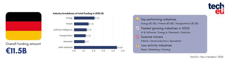 In 2025, Germany raised €11.5 billion, ranking second overall, with investment concentrated in a few core sectors rather than across high deal volume.