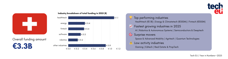 The ecosystem is characterised by a strong early-stage pipeline and close collaboration between startups, research institutions, and global investors. As demand for deeptech, healthcare, and climate solutions continues to grow globally, Switzerland remains well-positioned to play a significant role in developing and scaling the next generation of high-impact technologies (for more detailed analyses of the European technology ecosystem, check out Tech.eu’s annual report: European Tech 2025 – The Big Picture).