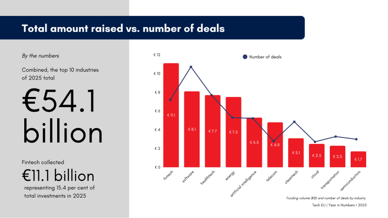 European tech investment totalled €72 billion in 2025, with stable deal activity and funding concentrated in fintech, software, healthtech, energy, and AI, highlighting continued investor focus on strategic and infrastructure-driven sectors.