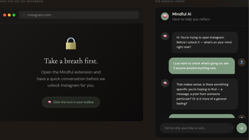 When you try to open a platform like Instagram, instead of loading immediately, you’re met with a calm pause screen. You can then open the Mindful popup and have a short exchange with an AI that asks why you want to go there, reflects your reasoning back to you, and gently challenges impulsive motives like boredom or restlessness.